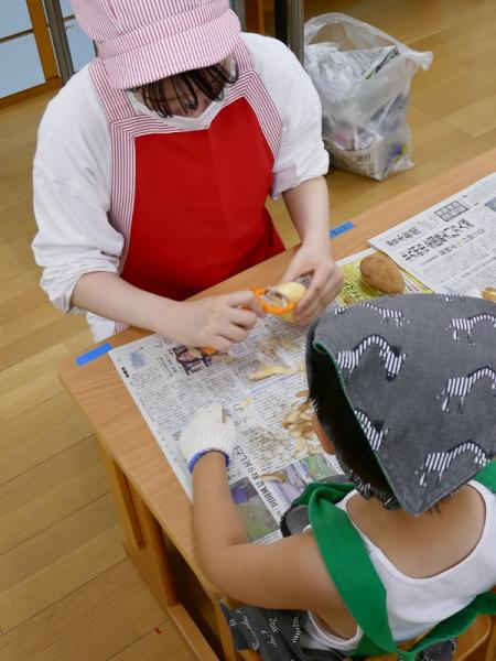 おいものかわ と トウモロコシのかわを みんなで むきました。