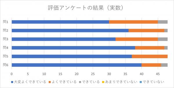 6問をお聞きし、回答は5段階で 5.大変よくできている~1.できていないから選択していただくかたちとし、48家族(回答率80%)の方々から感想をいただいております。結果は添付のグラフにまとめさせていただきました。